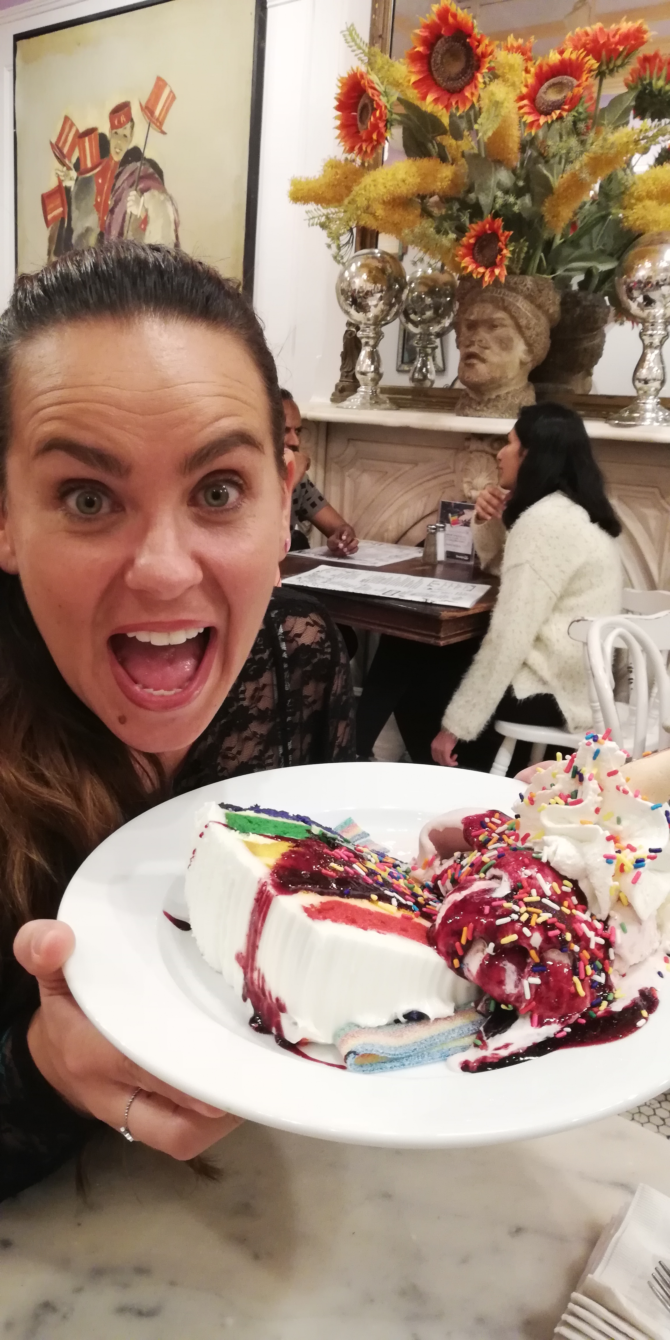 Il gelato, alla vaniglia e amarena, è servito in un piatto gigante insieme ad una fetta di torta tutta colorata (e piena di colorati ovviamente ma fa bene alla serendipità) con glassa di vaniglia, granella di smarties come topping e brillantini alimentari, il tutto corredato da due belle stringhe di caramelle con i colori dell’arcobaleno!