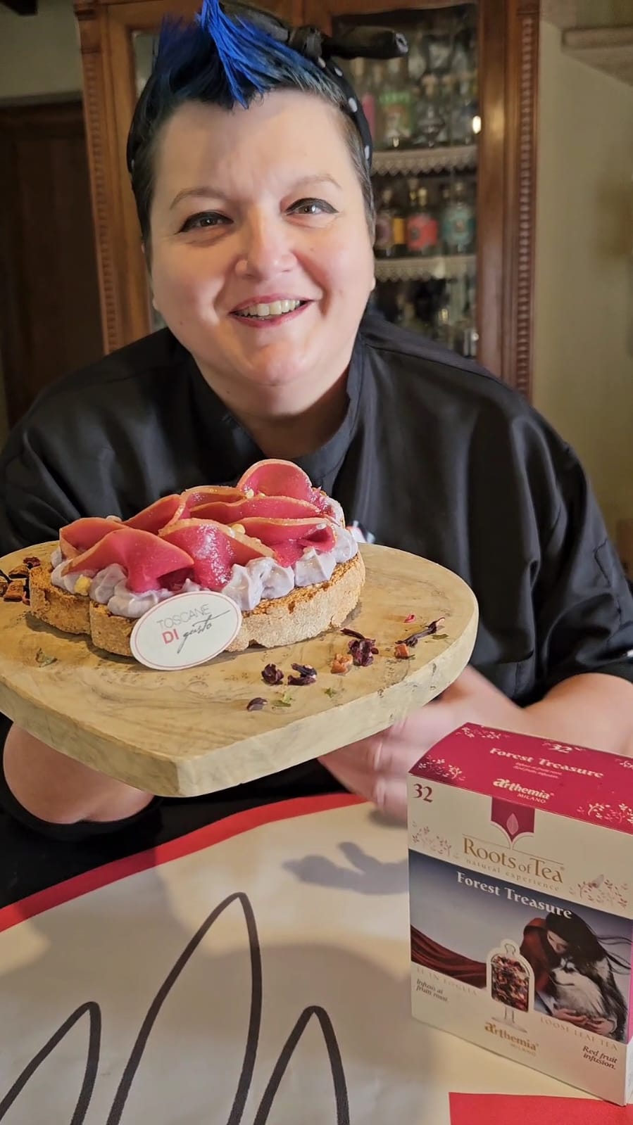 Per prima cosa occupiamoci delle pere. Tagliatele a fettine sottilissime con la mandolina. Mettetele a cuocere per un paio di minuti nell’infuso ai frutti rossi Arthema, aggiungendo un pizzico di sale e una macinata di pepe. Spegnete e, se avete tempo, lasciatele riposare nell’infuso anche un paio d’ore: più stanno lì, più si insaporiscono