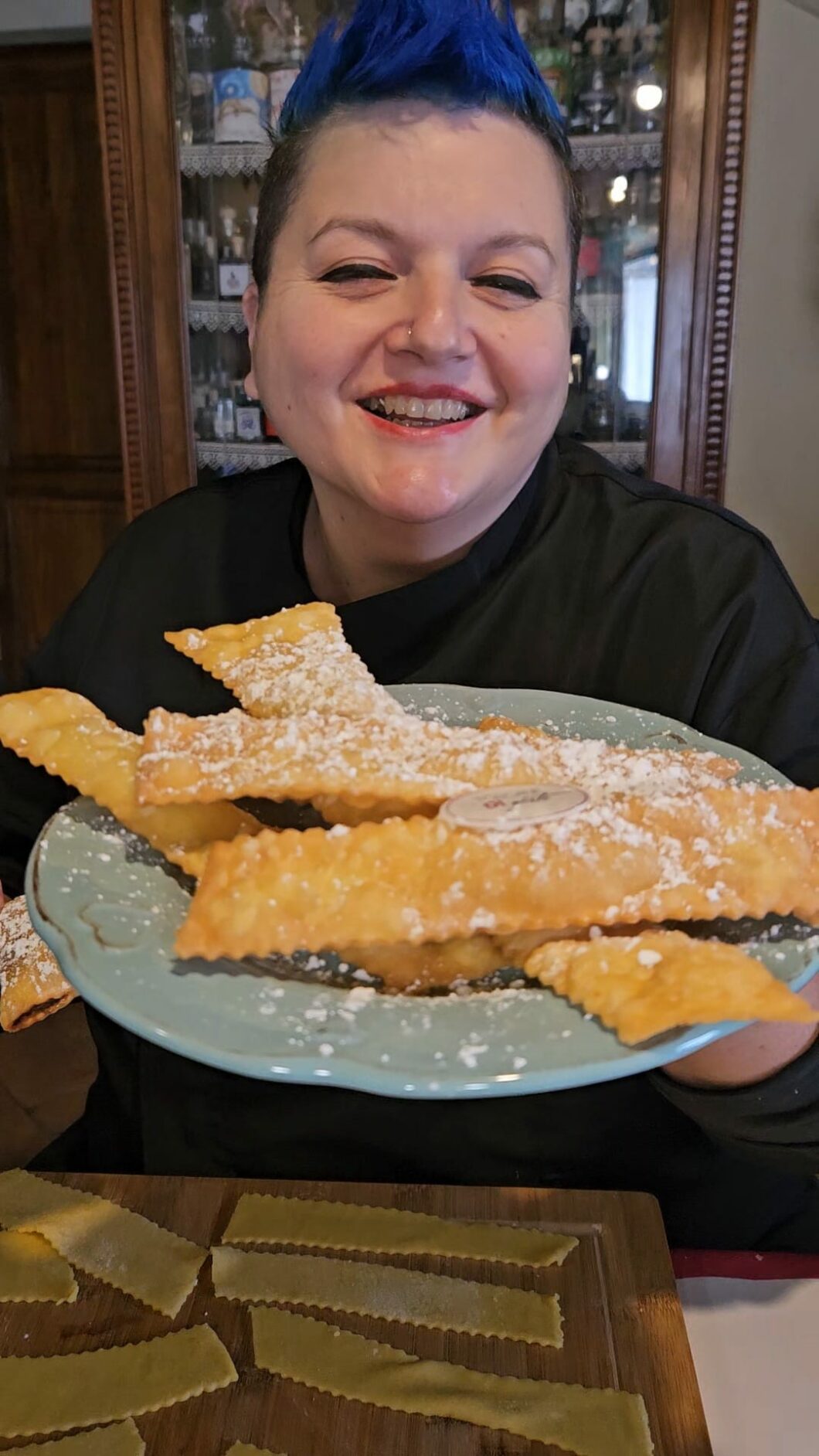 After resting, roll out the dough with a rolling pin until it’s about ½ cm thick. Cut it into strips or rectangles — traditionally, cenci are cut into ribbons, sometimes with a small slit in the center.