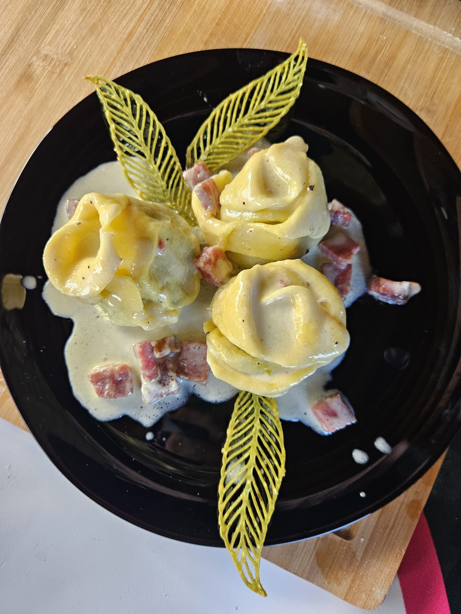 Stendete la pasta fresca fino ad ottenere una sfoglia sottile. Distribuite il ripieno sulla sfoglia e, con un tagliapasta, ricavate delle strisce.